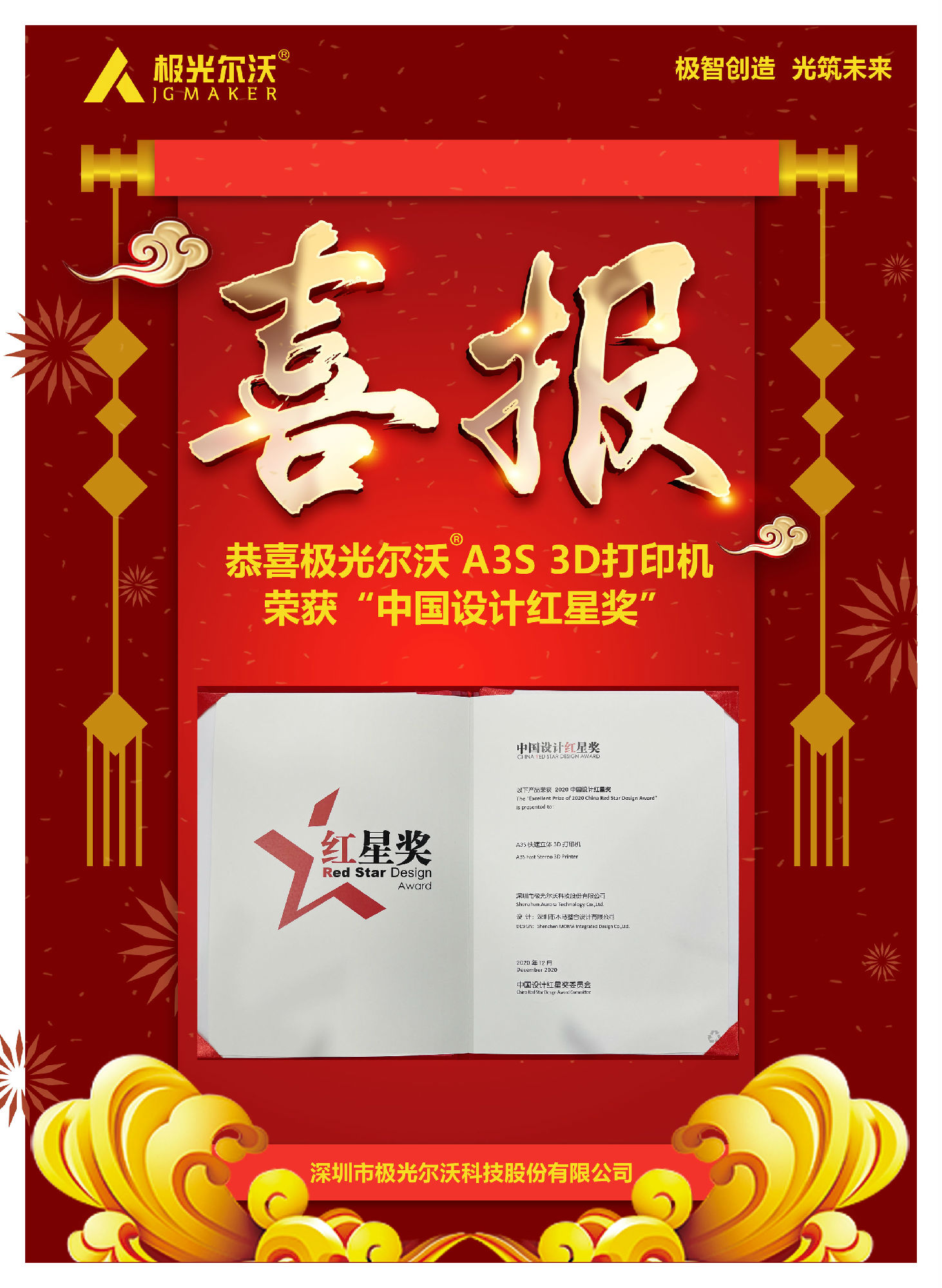 12月9日,2020中國設(shè)計(jì)紅星獎頒獎活動在北京舉行。2020年中國設(shè)計(jì)紅星獎以"融合的時代 凝聚的力量"為主題,來自全球5000家企業(yè)的7000余件產(chǎn)品參與角逐。極光爾沃A3S 3D打印機(jī)憑借新穎獨(dú)特的設(shè)計(jì)理念、簡潔純粹的產(chǎn)品形象從眾多產(chǎn)品中脫穎而出,獲得評委一致青睞,一舉拿下2020中國設(shè)計(jì)紅星獎。