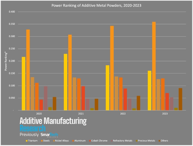 在評估金屬粉末市場時,平衡增長和銷量等因素非常重要。為了正確比較金屬材料對整個3D打印市場的重要性,AMR制定了一套實力排名的方式,最終將數據標準化以進行跨年比較。從 AMR 最新的實力排名圖表中,我們可以發現: