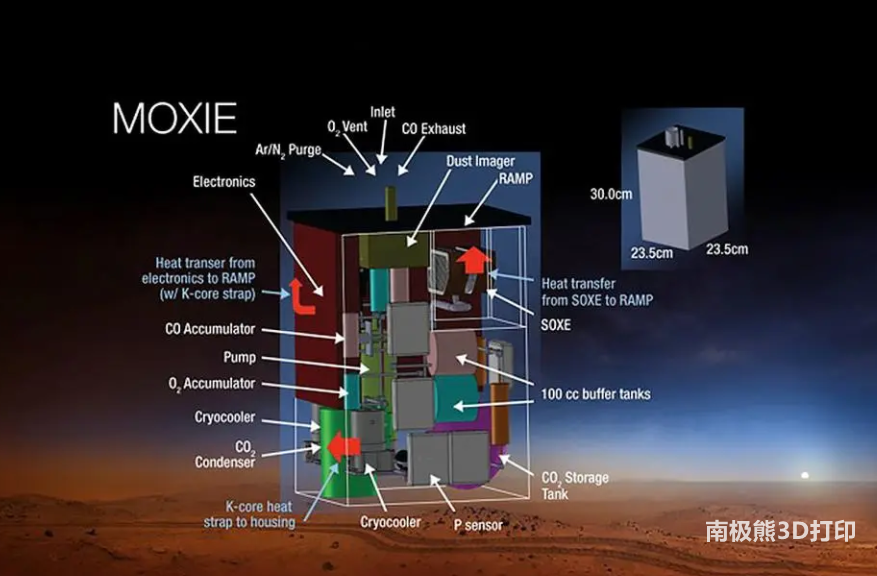 "毅力號 "火星車的其他6個3D打印部件在 "火星氧氣原位資源利用實驗 "儀器中,簡稱MOXIE。這個設備將測試新的技術(shù),未來可以生產(chǎn)工業(yè)數(shù)量的氧氣,在火星上制造火箭推進劑,幫助宇航員發(fā)射回地球。