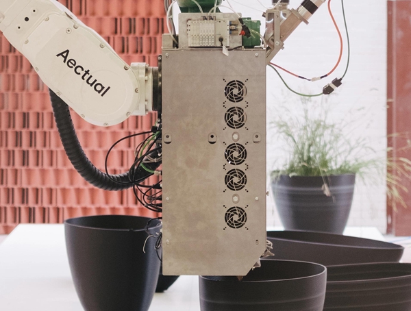 △Aectual公司的一臺3D打印機(jī)正在生產(chǎn)一個(gè)環(huán)保的花盆。圖片來自Aectual。