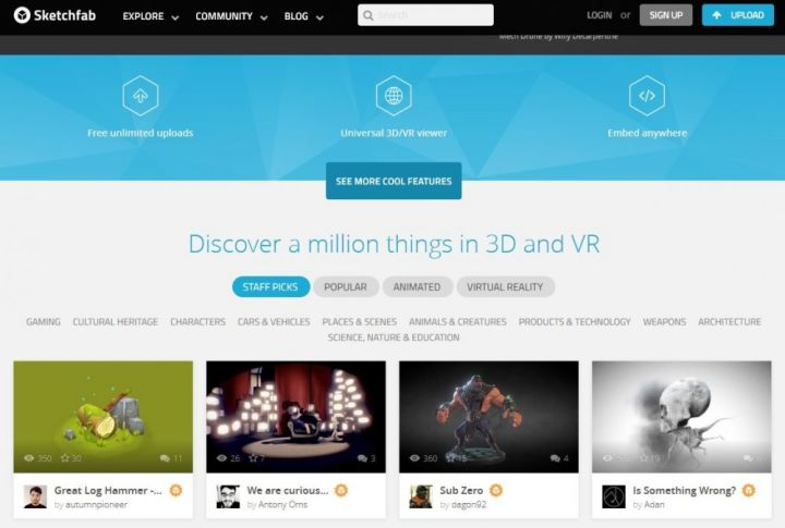 Sketchfab這個3D模型下載網(wǎng)站最主要有一些3D卡通人物及雕塑,每個模型都可以讓你360度旋轉(zhuǎn)欣賞。網(wǎng)站內(nèi)的3D模型相信多達一百萬個,有些是可以3D打印出來,而有些可能只適合用作製作3D電腦動畫。有時間可以進去逛逛,裡面有很多有趣的3D模型。