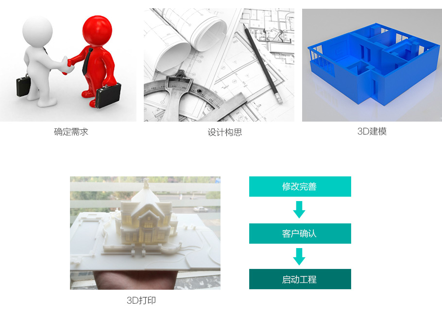 了解客戶需求→構(gòu)思設(shè)計→3D建模→3D打印出來→修改完善→客戶確認(rèn)→啟動工程。